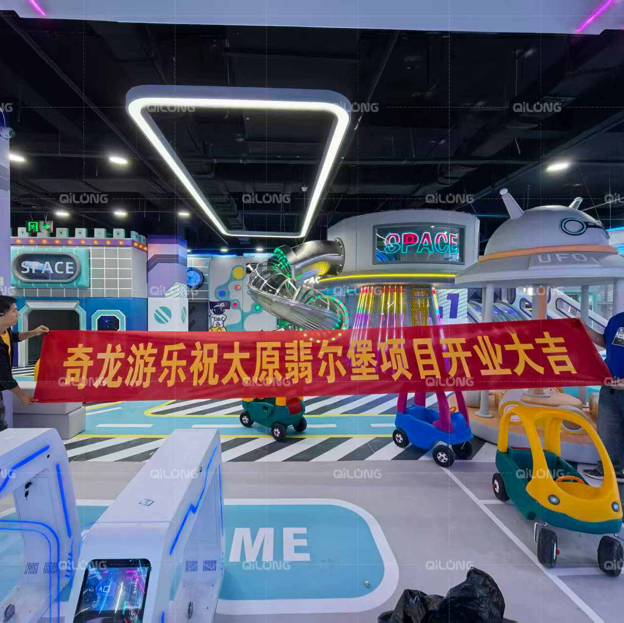 Various activity stations throughout the space offer different challenges and experiences, A UFO-shaped carousel spins kids into orbit, while a giant spiral slide connects multi-level platforms—perfect for zooming between “planets.”