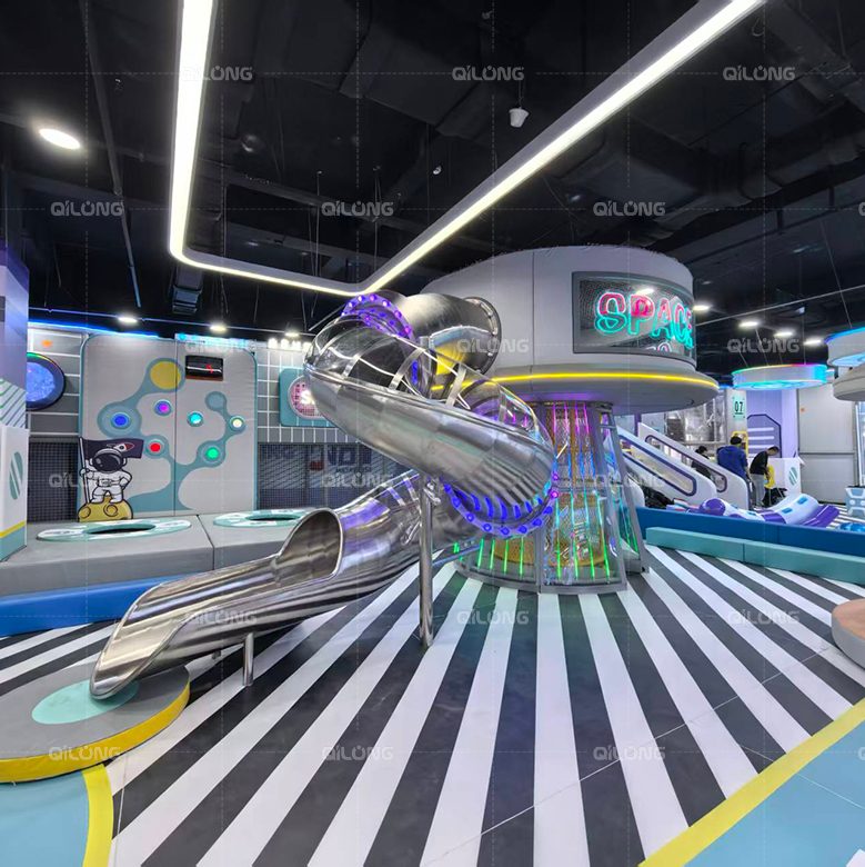 A shiny metallic spiral slide twists dramatically, letting kids “zoom through galaxies,” while transparent slides with embedded lights offer a futuristic twist. Both are designed with rounded edges and soft landings for safety.