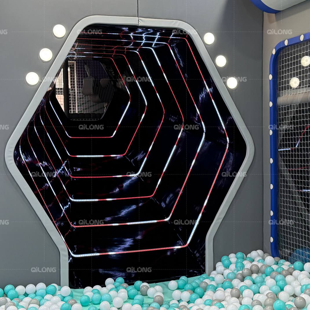 A hexagonal LED tunnel (lined with red and white light strips) leads to a ball pit filled with pastel - hued balls, encouraging kids to “explore alien planets.”
