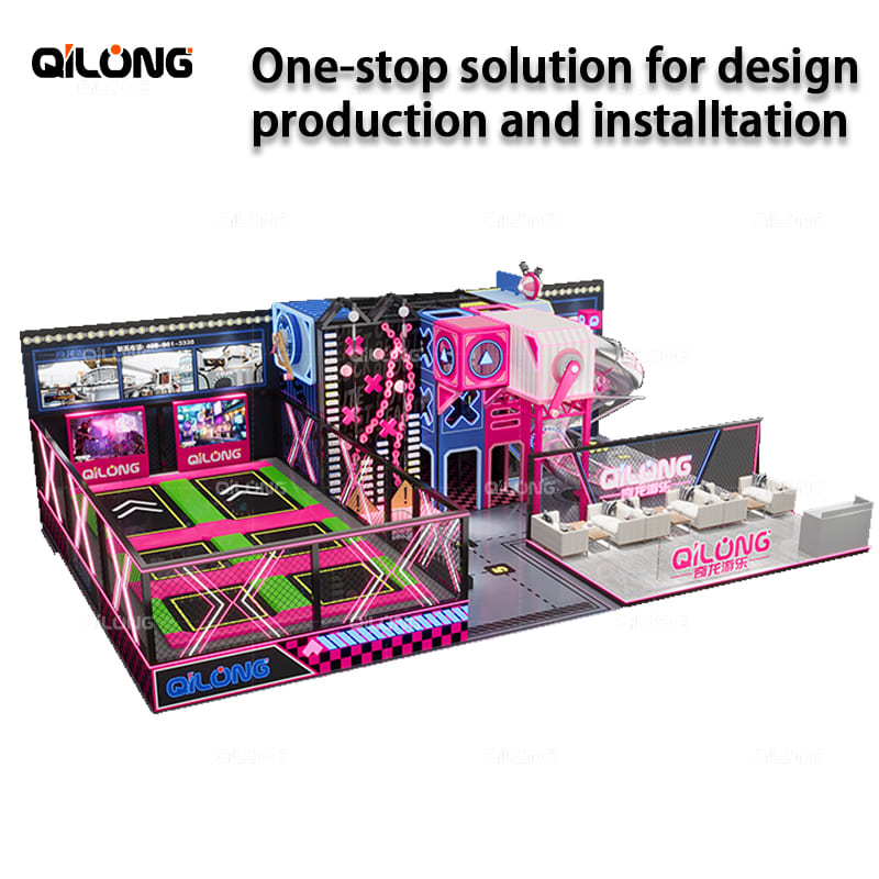 This is a small-scale trampoline park with a diverse range of play equipment, including trampolines, rock climbing walls, stainless steel spiral slides, and a resting area. Suitable for exhibitions and designed for players of various age groups to experience joy. The layout, size, and color scheme of the trampoline park can be customized to meet your requirements. We strive for optimal land usage, maximizing profitability through equipment selection and layout. A trampoline park is a highly popular and worthwhile investment!